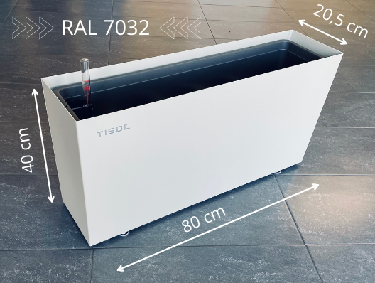 Štěrkově šedý květináč délka 80 cm pro vnitřní i venkovní použití. Kompletní sada pro umístění na terasu či balkón. Štíhlý tvar květináče TISOL®BlockPot si vystačí pouze s 20 cm. Samozavlažovací vyjímatelná vložka Plastia® Bergamot je zárukou bohaté úrody. O pohodlnou manipulaci při úklidu se postarají kvalitní pogumovaná kolečka. Duplexní povrchová úprava Zn + RAL 7016 zajistí spolehlivou protikorozní ochranu minimálně na 10 let.