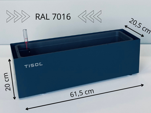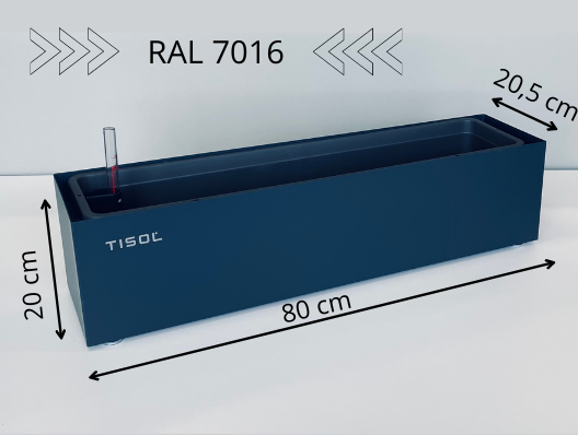Antracitově šedý květináč délka 80 cm pro vnitřní i venkovní použití. Kompletní sada pro umístění na terasu či balkón. Štíhlý tvar květináče TISOL®BlockPot si vystačí pouze s 20 cm. Samozavlažovací vyjímatelná vložka Plastia® Bergamot je zárukou bohaté úrody. O pohodlnou manipulaci při úklidu se postarají kvalitní pogumovaná kolečka. Duplexní povrchová úprava Zn + RAL 7016 zajistí spolehlivou protikorozní ochranu minimálně na 10 let.