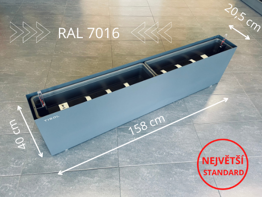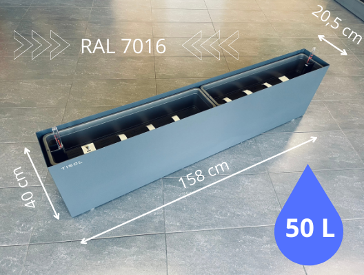 Antracitově šedý květináč délka 160 cm pro vnitřní i venkovní použití. Kompletní sada pro umístění na terasu či balkón. Štíhlý tvar květináče TISOL®LongPot si vystačí pouze s 20 cm. Samozavlažovací vyjímatelná vložka Plastia® Bergamot je zárukou bohaté úrody. O pohodlnou manipulaci při úklidu se postarají kvalitní pogumovaná kolečka. Duplexní povrchová úprava Zn + RAL 7016 zajistí spolehlivou protikorozní ochranu minimálně na 10 let.