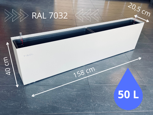 Štěrkově šedý květináč délka 160 cm pro vnitřní i venkovní použití. Kompletní sada pro umístění na terasu či balkón. Štíhlý tvar květináče TISOL®LongPot si vystačí pouze s 20 cm. Samozavlažovací vyjímatelná vložka Plastia® Bergamot je zárukou bohaté úrody. Pohodlnou manipulaci při úklidu zajistí kvalitní pogumovaná kolečka. Duplexní povrchová úprava Zn + RAL 7032 je zárukou spolehlivé protikorozní ochrany (min. 10 let). O bezstarostné zalévání se postará nádrž na vodu (50 litrů) v kombinaci se solární závlahou. Solární závlaha není součásti.